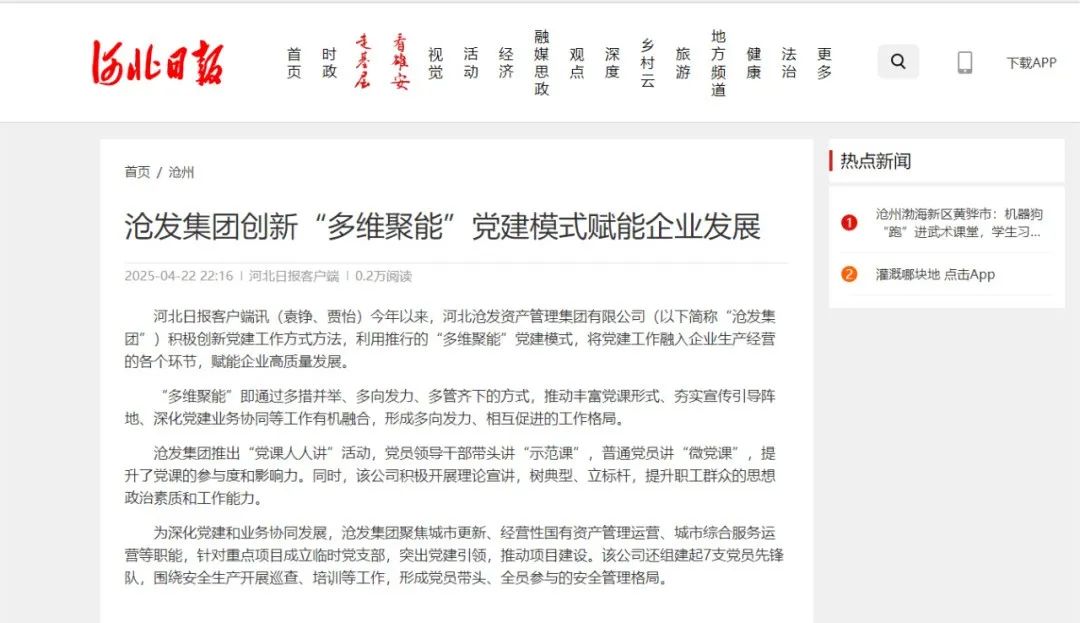 河北日报客户端刊发文章:《沧发集团创新“多维聚能”党建模式赋能企业发展》