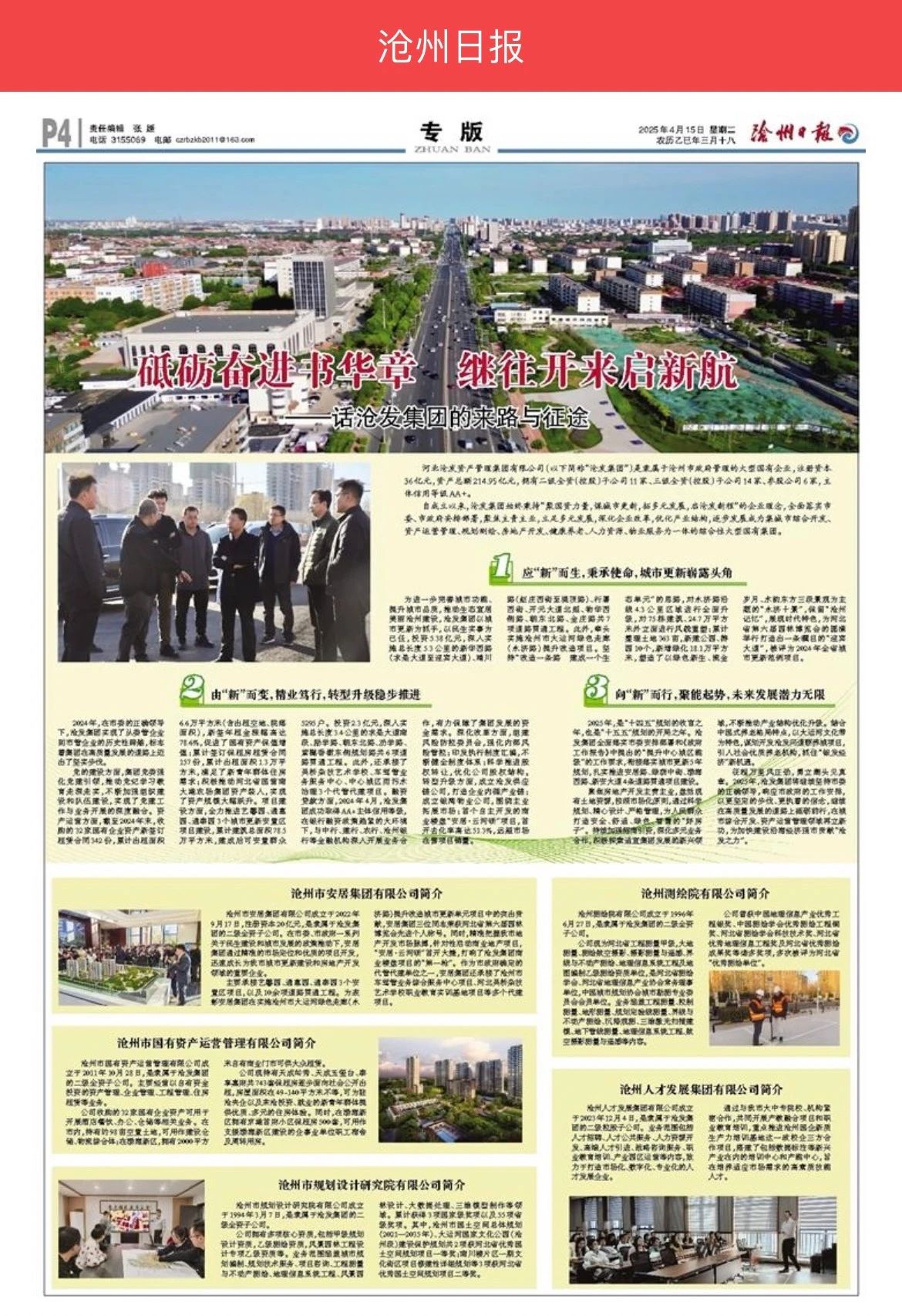 砥砺奋进书华章 继往开来启新航 ——话沧发集团的来路与征途 河北沧发资产管理集团有限公司(以下简称“沧发集团”)是隶属于沧州市政府管理的大型国有企业,注册资本36亿元,资产总额214.95亿元,拥有二级全资(控股)子公司10家,三级全资(控股)子公司12家,参股公司4家,主体信用等级AA+。 自成立以来,沧发集团始终秉持“聚国资力量,谋城市更新,拓多元发展,启沧发新程”的企业理念,全面落实市委、市政府安排部署,聚焦主责主业,立足多元发展,深化企业改革,优化产业结构,发展成为集房地产开发、资产运营管理、规划测绘、城市更新、健康养老、物业服务等业务为一体的综合性企业集团。 一、应“新”而生,秉承使命,城市更新崭露头角 为进一步完善城市功能、提升城市品质,推动生态宜居美丽沧州建设。沧发集团以城市更新为抓手,以民生实事为己任,深入实施总投资5.38亿元、总长度5.3公里的新华西路(求是大道至迎宾大道)、晴川路(赵庄西街至堤顶路)、行署西街、开元大道北延、物华西侧路、朝东北路、金庄路共7项道路贯通工程。此外,牵头实施沧州市大运河绿色走廊(永济路)提升改造项目。坚持“改造一条路 建成一个生态单元”的思路,对永济路沿线4.3公里区域进行全面升级,对75栋建筑、24.7万平方米外立面进行风貌重塑;累计整理土地363亩,新建公园、游园10个,新增绿化18.1万平方米,塑造了以绿色新生、流金岁月、水韵东方三段景观为主题的“永济十景”,保留“沧州记忆”,展现时代特色,为河北省第六届园林博览会的圆满举行打造出一条瞩目的“迎宾大道”,被评为2024年全省城市更新范例项目。 二、由“新”而变,精业笃行,转型升级稳步推进 2024年,在市委的正确领导下,沧发集团实现了从委管企业到市管企业的历史性跨越,标志着集团在高质量发展的道路上迈出了坚实步伐。 党的建设方面,集团党委强化党建引领,推动党纪学习教育走深走实,不断加强组织建设和队伍建设,实现了党建工作与业务开展的深度融合。资产运营方面,截至2024年末,收购的32家企业资产新签订租赁合同342份,累计出租面积6.6万平方米(含出租空地、院落面积),促进了国有资产保值增值;累计签订保租房租赁合同157份,累计出租面积1.3万平方米,满足了新青年群体住房需求;积极推动河北省国营南大港农场集团资产装入,实现了资产规模的大幅跃升。项目建设方面,全力推进艺馨园、通惠园、通泰园3个城市更新安置区项目建设,累计建筑总面积85.4万平方米,建成后可安置群众5295户。深入实施总投资2.3亿元、总长度3.4公里的求是大道南段、励学路、朝东北路、劝学路、紫樾香榭东侧规划路共6项道路贯通工程。此外,还承接了车驾管业务服务中心、中心城区雨污水治理、吴桥杂技艺术学校3个代管代建项目。信用评级方面,2024年4月,沧发集团成功取得AA+主体信用等级,与中行、建行、农行、沧州银行等金融机构深入开展业务合作,有力保障了集团发展的资金需求。深化改革方面,组建风险防控委员会,强化内部风险管控;印发执行制度汇编,不断健全制度体系;科学推进股权转让,优化公司股权结构。转型升级方面,成立沧发供应链公司,打造企业双循产业链;成立沧发物业公司,围绕主业拓展市场;首个自主开发的商业楼盘“安居·云河颂”,首开去化率高达51.3%,远超市场在售项目销量。 三、向“新”而行,聚能起势,未来发展潜力无限 2025年,是“十四五”规划的收官之年,也是“十五五”规划的开局之年。沧发集团全面落实市委安排部署和《政府工作报告》中提出的“提升中心城区能级”的工作要求,衔接落实城市更新5年规划,扎实推进安居路、绿荫中街、渤海西路、新安大道4条道路贯通项目建设。 聚焦房地产开发主责主业,盘活现有土地资源,按照市场化原则,通过科学规划、精心设计、严格管理,为人民群众打造安全、舒适、绿色、智慧的“好房子”。持续加强招商引资,深化多元业务合作,积极探索适宜集团发展的新兴领域,不断推动产业结构优化升级。结合中国式养老格局特点,以大运河文化带为特色,谋划开发康养项目,抓住“银发经济”新机遇。 征程万里风正劲,勇立潮头见真章。2025年,沧发集团将继续坚持市委的正确领导,响应市政府的工作安排,以更坚定的步伐、更执着的信念,继续在高质量发展的道路上砥砺前行,为加快建设沿海经济强市贡献“沧发之力”。